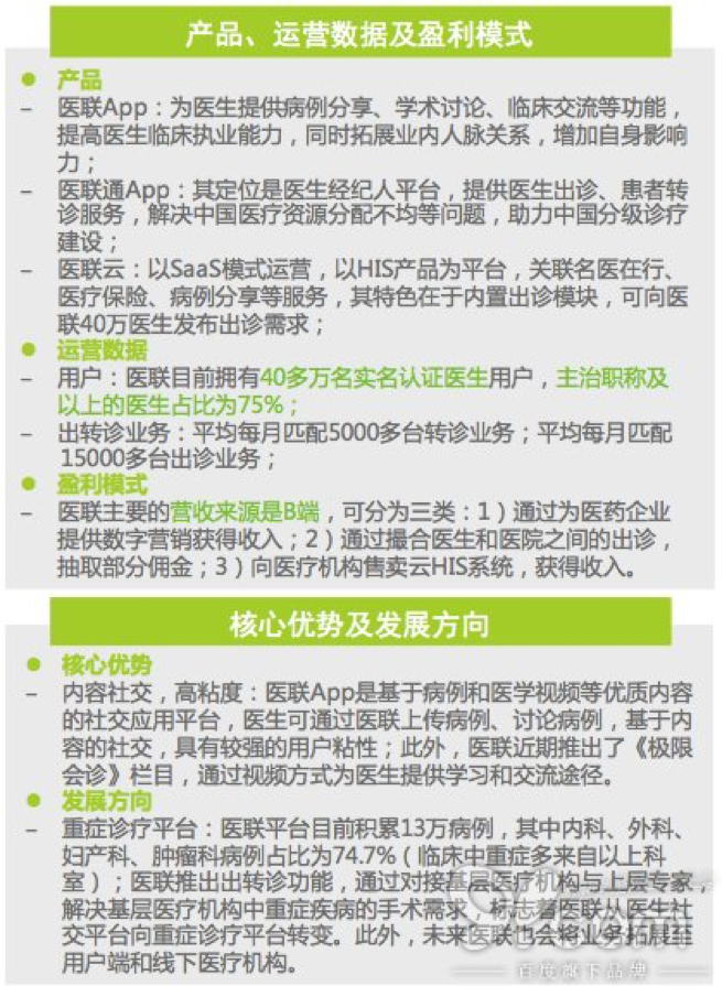 目前,医联已经形成三大业务,1、医生社交平台医联APP为医生提供病例分享、学术讨论、临床交流等功能,提高医生临床执业能力,同时拓展业内人脉关系,增加自身影响力;2、医生经纪人平台医联通APP,提供医生出诊、患者转诊服务;3、HIS平台医联云,关联名医在行、医疗保险、病例分享等服务,突出出诊特色模块,可向医联40万医生发出出诊的需求。